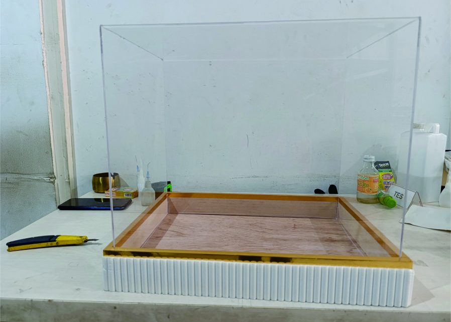 Proses pemotongan menggunakan laser cutting menghasilkan potongan yang halus dan presisi. Setelah itu, akrilik dirakit menjadi box display dengan teknik bending dan lem khusus agar kuat, rapi, dan tidak meninggalkan bekas sambungan. - Finishing Eksklusif