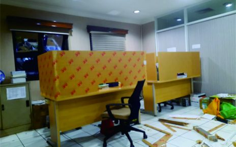 Partisi meja rapat menggunakan akrilik MC 3 mm bening dengan dimensi panjang 300 cm dan tinggi 60 cm tanpa sambungan, sedangkan 2 sekat tengah dimensi panjang 160 dan tinggi 60 cm tanpa sambungan.