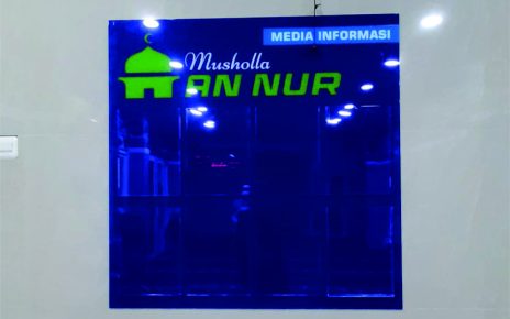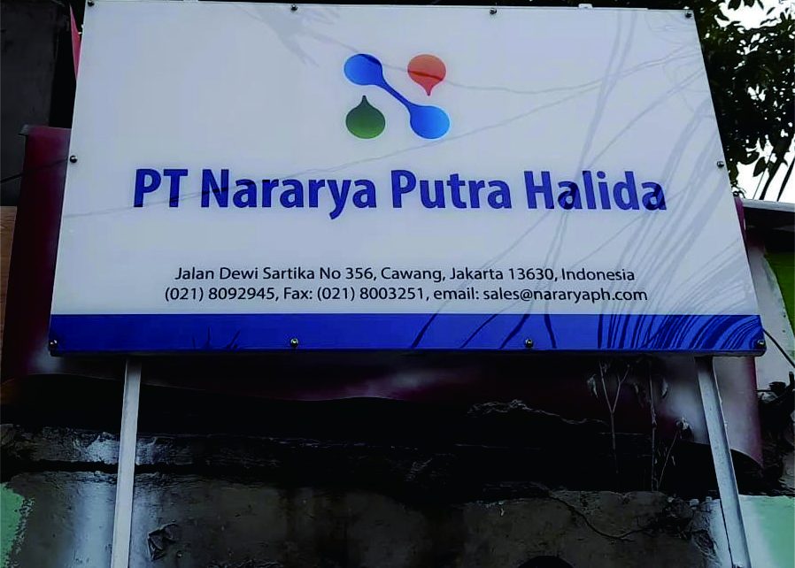 Signage PT. Nararya menggunakan akrilik MC bening 5 mm dan cutting stiker mirror merk oracall.